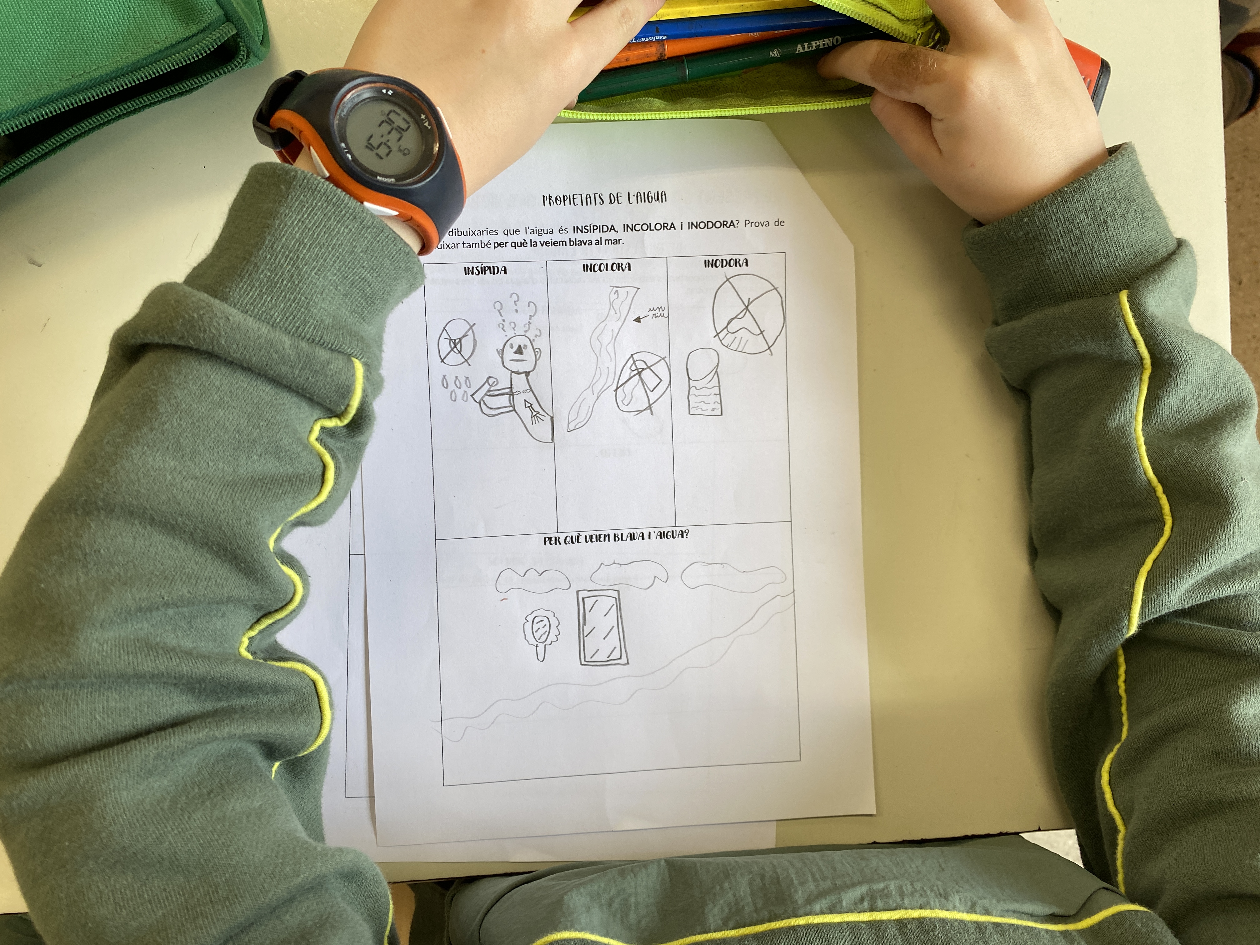 Aquests dies hem treballat contínuament amb el mateix suport: un dossier amb explicacions sobre la composició i les propietats de l’aigua. Ja us vam explicar fa dues setmanes que vam organitzar el projecte en blocs de continguts. Un d’ells respon precisament a l’aigua com a substància: què és, què la forma, com canvia, per què canvia, quines particularitats té... La metodologia sempre ha estat la mateixa: llegim conjuntament, subratllem la informació que considerem més important, responem dubtes i exemplifiquem aplicant el que hem après a d’altres contextos. L’exercici d’aplicar el coneixement en altres escenaris, encara que sigui de forma teòrica, ens assegura que l’aprenentatge és significatiu i s’està assolint.